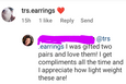 "TRs Earrings are beautifully crafted and I have received many compliments from people on how great they look!! I highly recommend TRs earrings!! Great work! Great look!"