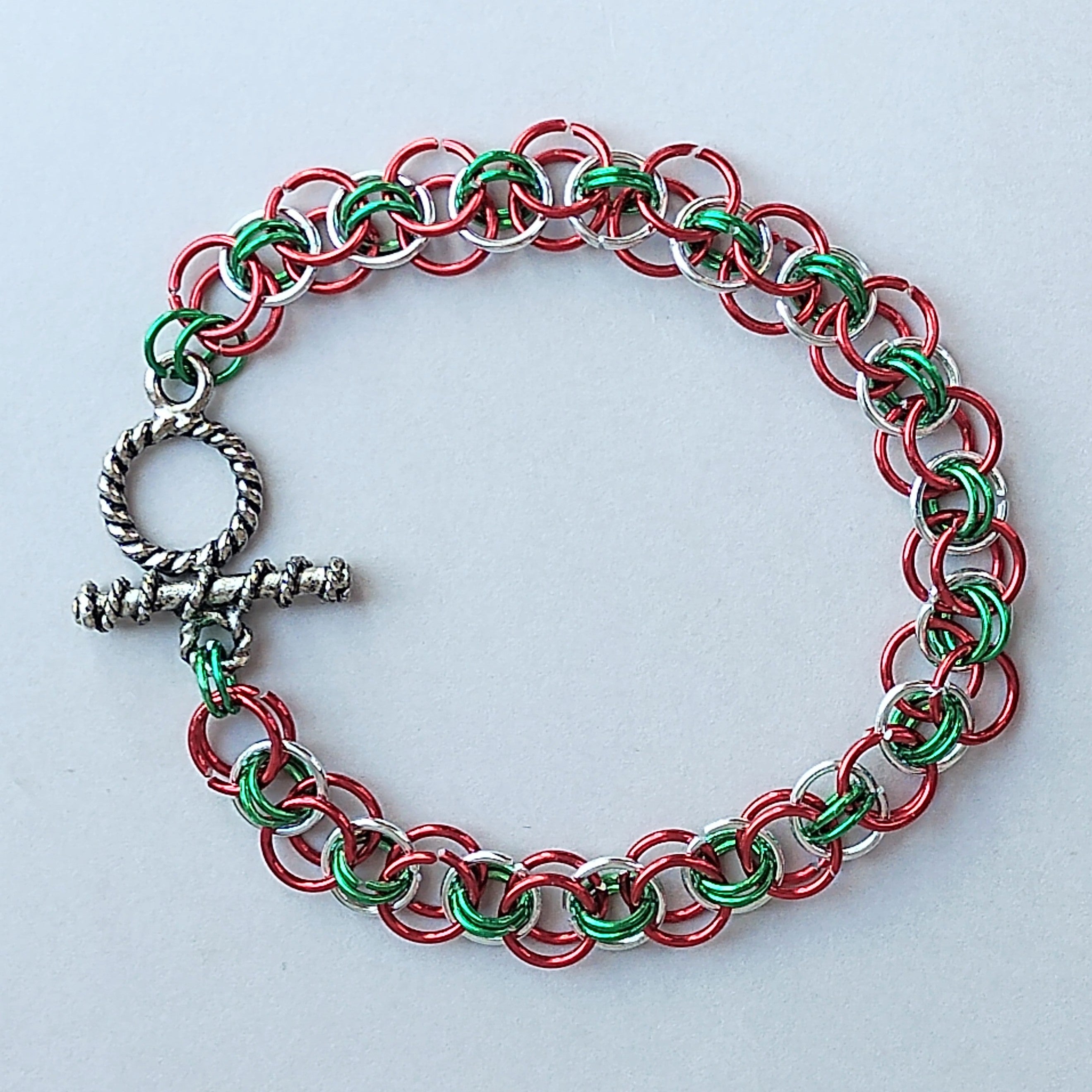 Don’t miss out on this charming red and green chainmaille bracelet—order yours today and celebrate the holidays in style!