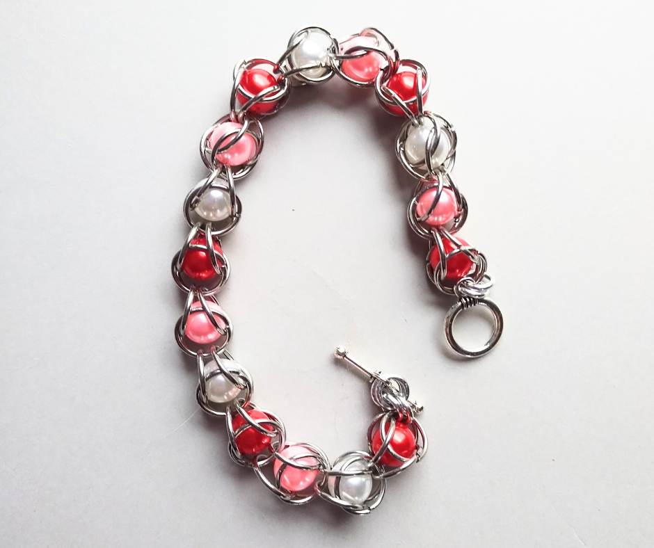 π Red, Pink and Pearl Captured Bead Chainmaille Bracelet