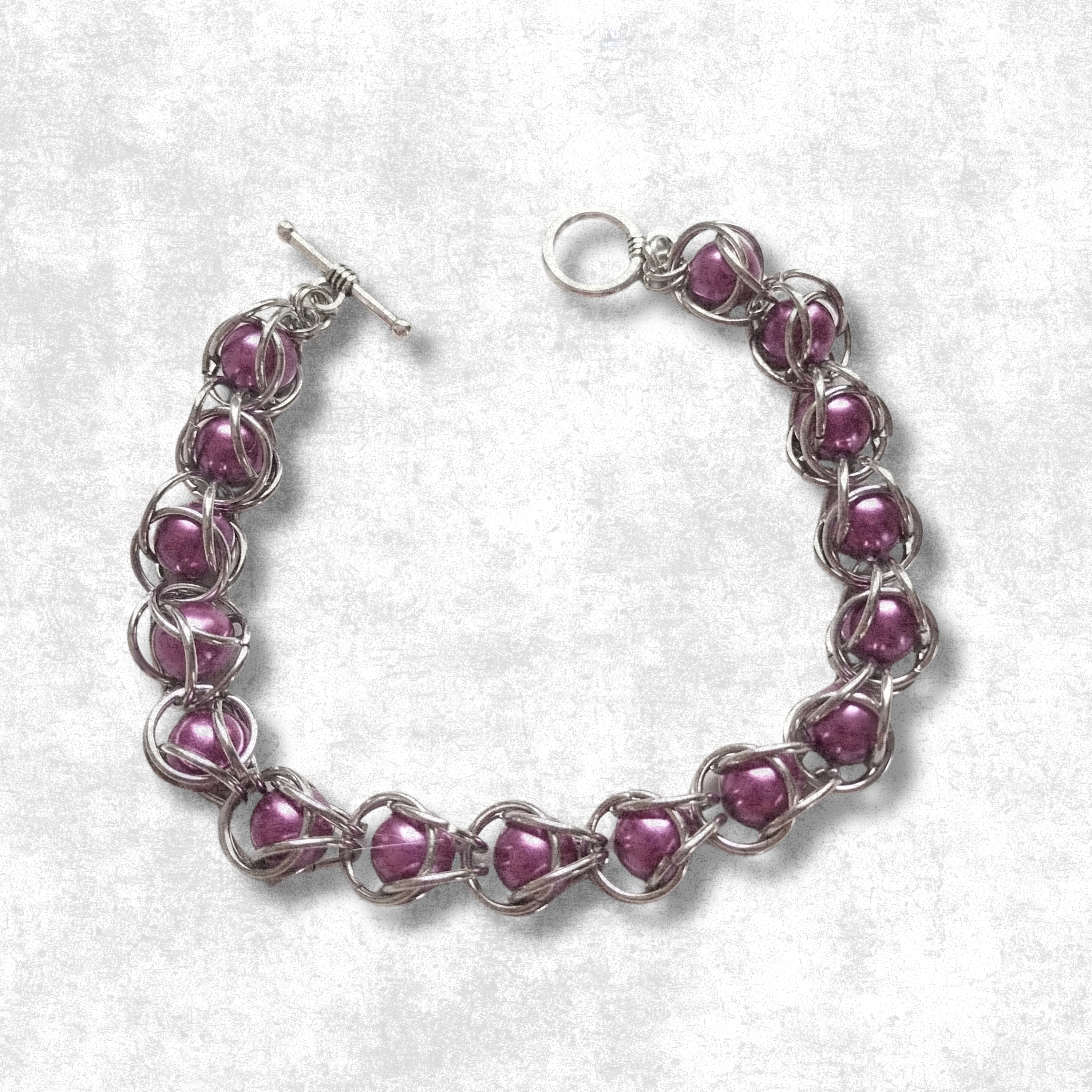 A rich purple bead is beautifully captured within handwoven chainmaille links, creating a bracelet that blends elegant color with intricate texture. Lightweight and comfortable, this design adds a subtle statement while remaining easy to wear all day.