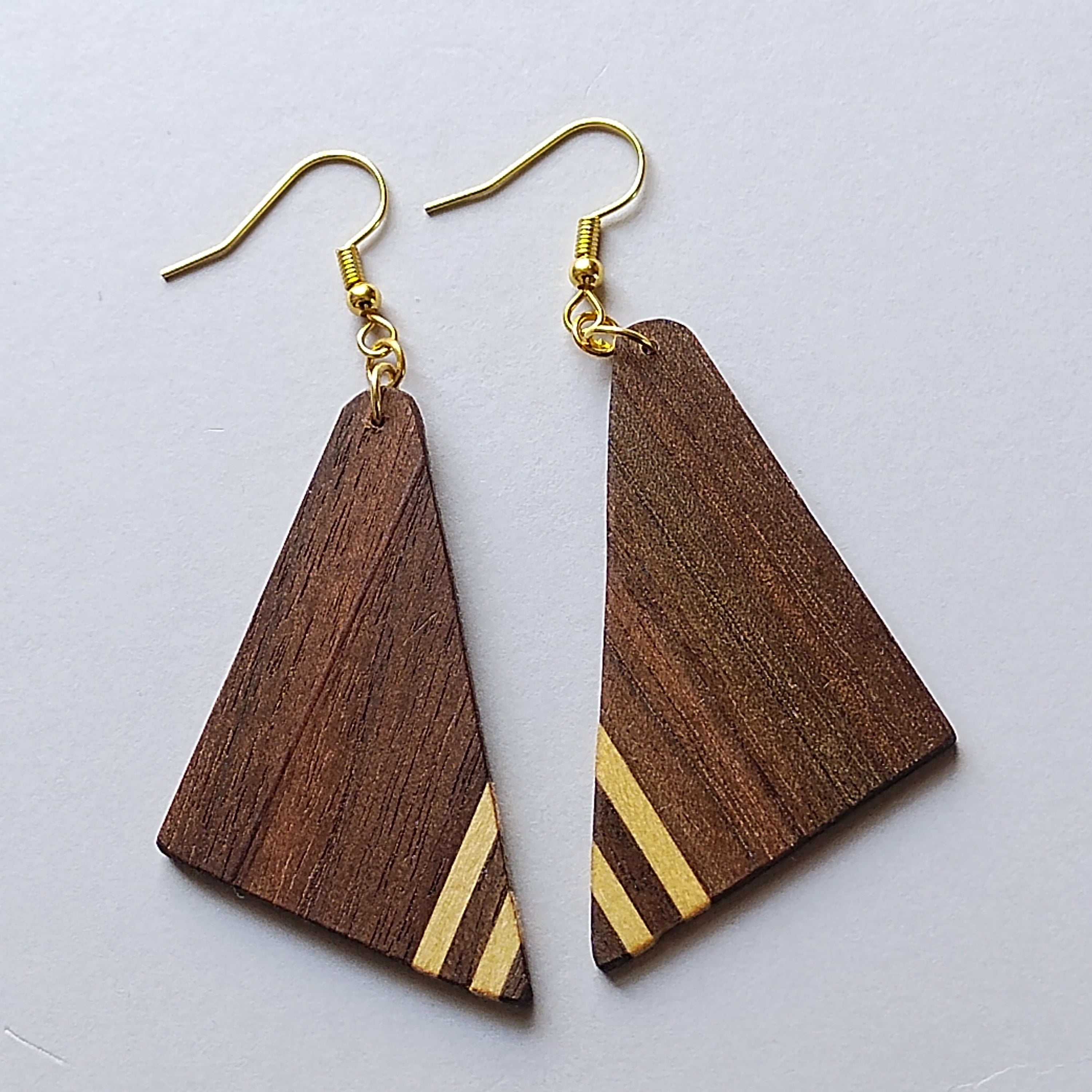 These 3-inch earrings feature a stylish triangular shape made of rich walnut, beautifully accented by contrasting basswood for a sophisticated look.