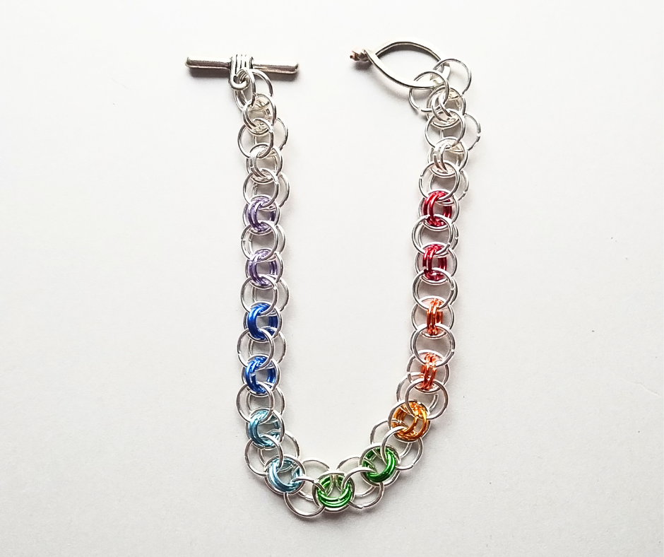This Silver Rainbow Helm Weave chainmaille bracelet blends sleek silver tones with soft rainbow accents for a look that’s playful yet refined. The flowing Helm weave creates gentle movement and texture, allowing hints of color to catch the light while keeping the overall design clean and versatile.